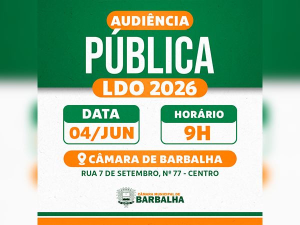 A Câmara Municipal de Barbalha convida você para participar da Audiência Pública sobre a Lei de Diretrizes Orçamentárias (LDO) 2026, que acontecerá no dia 4 de junho, às 9h da manhã, no Plenário da Câmara Municipal de Barbalha.