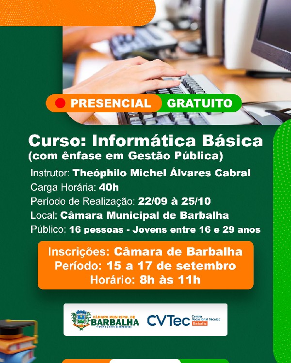 A Câmara Municipal de Barbalha, em parceria com o CVTec, está com inscrições abertas para o Curso de Informática Básica (com ênfase em Gestão Pública)!